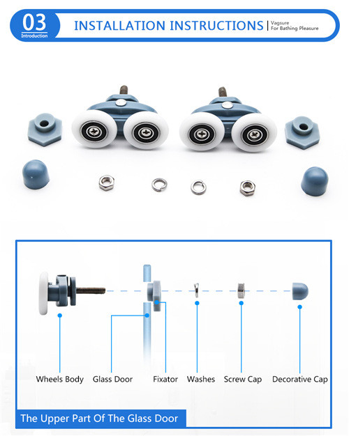 바퀴, 23mm, 25mm, 및 27mm를 미끄러지기의 직경의 3개의 선택권이 있습니다. 4-6mm 간격 유리 문을 위해 적당할 수 있다 그래야. 2명의 패널 측 오프닝 문, 4pcs 위로 신청된 세트 당 8pcs가 및 4pcs를 아래로 있습니다. 그러나 세트 당 4pcs는 또한 단 하나 미끄러지는 샤워 문을 위해, 한 벌 판매될 수 있습니다.
