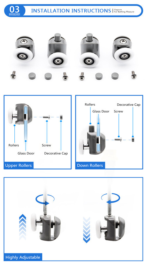 이름이 건의한 대로, 미끄러지는 기능을 효과적이기 위하여 만드도록 주로 샤워 오두막 샤워 울안의 유리제 샤워 문에 사용되는 미끄러지는 샤워 호차. 다른 미닫이 문은 다른 미끄러지는 폴리 롤러를 필요로 합니다. 롤러의 직경은 주문을 받아서 만들어질 수 있습니다, 세부사항은 상담하고 이해하기 위하여 환영받습니다.
