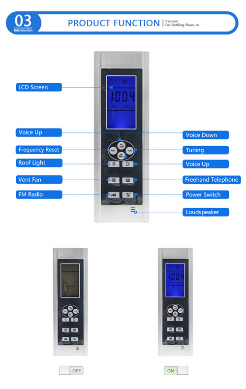 다른 부속품과 배기 엔진과 같은 결합된 샤워 오두막에 주로 적용되는 등 다만 통제 panle, 스피커, 지도한 빛, 전원 연결 장치입니다. 이 디지털 방식으로 제어반과, 사용자를 위해 더 편리합니다 즐깁니다 다수 기능으로 샤워를. 가동 공용영역에는 열쇠 누르 그리고 LCD 스크린 접촉이 있습니다. 우리가 조회를 상담하고 보내는 것을 가지고 있는 샤워 오두막의 제어반, 환영의 다양성.