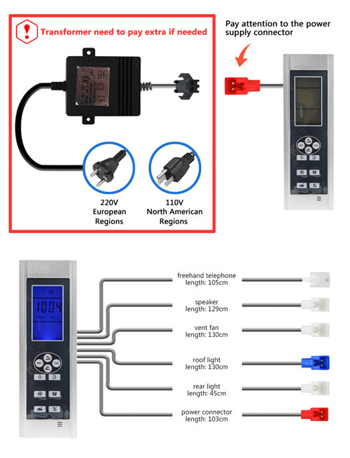 이 제어반의 평가한 전압은 에너지 절약 AC 12V만 이고 널리 이용될 수 있습니다. 가동 공용영역은 중요한 누르기, 과민한 반응 반영합니다 빠른 응답을 사용합니다. 지상 열쇠는 환풍 팬, 지붕 빛, FM 라디오, 빈도 리셋, 손으로 그린 전화, 확성기, 음성 및 위 통제를 아래로 포함합니다. 관련 부속품이 환풍 팬, 지붕 및 후방 빛이다 그래야, 스피커. What는 변압기 더 당신이 필요로 하는 경우에 제공됩니다. 그리고 기능은 조용한 다양합니다.