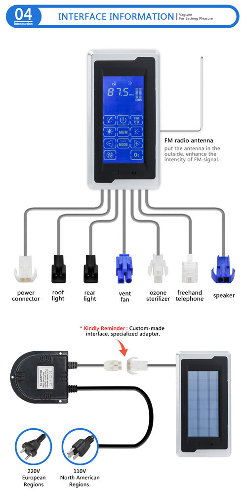 불규칙한 디자인은 그것을 봅니다 특별하게 만듭니다. 이 관제사의 물자는 새로 아BS, 더 튼튼하고, 항균, 청소하게 쉬운 그리고 부수게 쉬운 입니다. 연에 따르면, 스피커의 연은 144cm의 환풍 팬이고 지붕 빛은 149cm의 후방 빛입니다 123cm, 손으로 그린 전화입니다 38cm의 전원 연결 장치입니다 123cm의 오존 살균제입니다 153cm입니다. 이 제어반의 평가한 전압은 에너지 절약 AC 12V만 이고 널리 이용될 수 있습니다. 방수 급료는 IPX5, throughtly 안으로 방지합니다 물 교류를입니다. 상담하는 일치된 부속품은 환영받습니다 또한 판매됩니다.