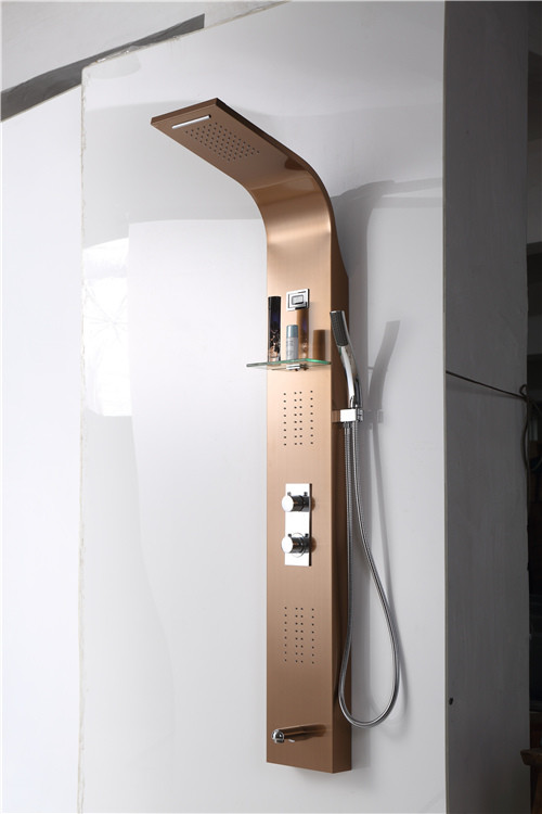 그것은 샤워 란, 부드럽게 한 유리제 선반설치, 샤워 믹서 꼭지, 머리 샤워, 손 샤워, 뒤 안마 제트기, 1.5m 스테인리스 고무줄 호스로 이루어져 있습니다. 주요 물자는 304# 스테인리스입니다. 고품질 스테인리스 materail, 그것에는에 감사 우수한 내식성 및 열저항이 있고, 훨씬 튼튼합니다 및 쉽지 않게 개악입니다. 샤워 패널은 5개의 형태가 있습니다: 강우와 최고 샤워 꼭지에 의하여 제공한 폭포 샤워; 뒤 제트기에서 수평한 안마 살포 (정상은 살포하기 위하여 아래로 분할되고); 손 샤워 whith 소형 샤워 꼭지는, 긴 탄력 있는 호스 당신이 몸 전체 융통성을 세척하는 것을 허용합니다; 아래로 꼭지에서 통 주둥이. 물을 주는 다양한 방법은 다른 사용자 요구를 만족시키고 몸을 완전히 세척합니다. 수온은 디지털 방식으로 온도 전시에 교대 faucst 그리고 쇼 정도에 온도 눈금으로 정확하게 통제될 수 있습니다. 온도 조절 장치 체계는 적당한 온도를 유지하고, 당신의 샤워 에너지를 만들고 위로합니다. 거기 편리한 패널에 유리제 선반설치가, 세면용품을 가지고 가고 두게 있습니다.