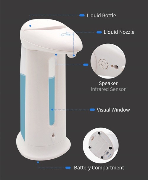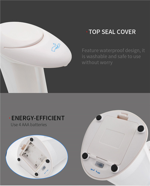 이 액체 비누 분배기는 자동화된 전자인 혁신적인 것입니다. 그것은 코드가 없습니다, 4 AAA batterise에 의해 강화해. 고품질 아BS 물자와 고요함 좋은 물개 디자인으로, 방수와 걱정 없이 사용하는 것이 안전합니다. 붙박이 적외선 똑똑한 감지기, 빠른 반응. 액체 비누는 0.25s 안에 밖으로 흐를 것입니다. 그것은 쉽습니다 시간절약 입니다. 그것, 그것에 시각적인 언제 추가하기 위하여 액체 비누가 사용한지 얼마를 보게 쉽 알고 있습니다. 최고 물개 덮개는 위에 제거하고 두기 쉽습니다. 400ml를 위한 큰 수용량, 를 사용하는을 위한 장시간. 혁신적인 비 드립 디자인은 낭비와 싱크대 혼잡을 삭제합니다. 완전히 자동 적이고 및 접촉 자유로운 가동은, 두번째 교차 감염을 피합니다. 반대로 미끄러짐 기초 지원을 가진 독립 구조로 서있는 디자인은, 절묘한 소형 디자인과 더불어, healty를 위한 이중 즐거움 및 훈장, 목욕탕, 부엌, 사무실, 학교, 병원, 호텔 및 대중음식점에 사용하기 위하여 완전히 합니다.